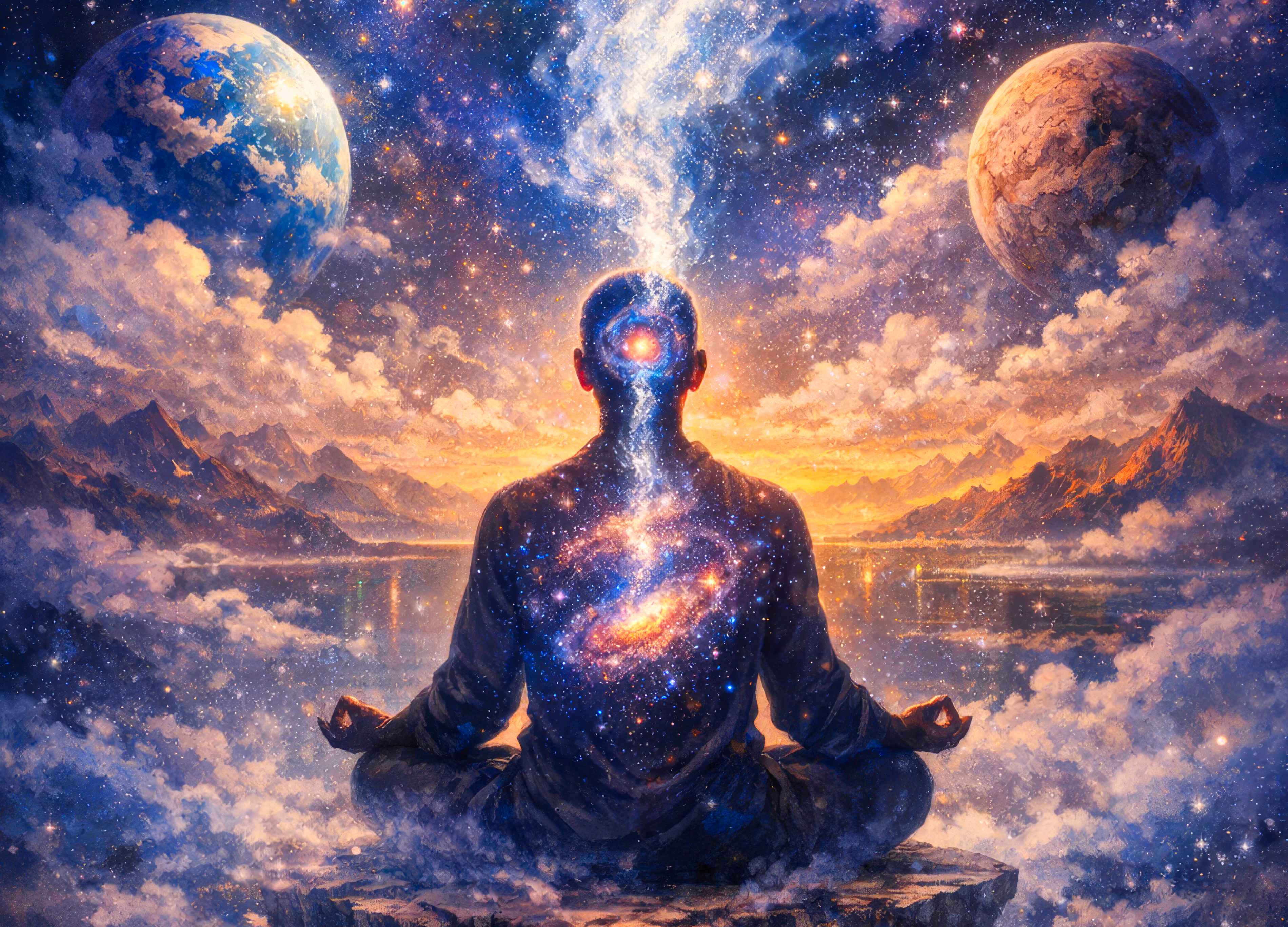 Inner life ![]() Ik ben een gedachte die zichzelf vergeet. Een nevel in het brein van de kosmos. Waar vormen vervagen en betekenis smelt tot licht. Ik ben niet hier. Ik ben daar. Daar waar de sterren dromen. Waar adem geen lucht is maar een stroom van weten zonder van mij te zijn. Mijn lichaam zit. Mijn wezen zweeft. Zwevend tussen planeten die luisteren in een taal die ouder is dan de tijd. Een oog opent zich boven mij, niet om te zien, maar om te herinneren dat ik de echo ben van het Grote Weten dat zich uitdrukt in stite. Ik adem uit en de kosmos ademt in. Er is geen binnen, En er is geen buiten. Alleen een dans tussen vorm en oneindigheid. Ik ben niet iets, Ik ben niet niets. Dat ben ik. Een droom die het universum zichzelf vertelt. |